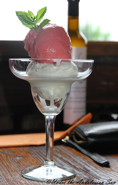 Jäätelö täällä ei ole itsetehtyä, vaan tulee kouvolalaiselta Caminitolta. Erinomaista jäätelöä se tosin on ja tuo minttu sen sijaan tulee ihan omasta puutarhasta. Itse tyydyin limoncelloon - sillähän täytyy olla jotain ruoansulatusta edistäviä superfood-vaikutuksia...?