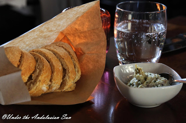 Aperoiksi otimme kesäkuumalla raikastavat rieslingit. Sitten pöytään tuotiinkin paikan leipää maa-artisokkalevitteellä. Hyvää.